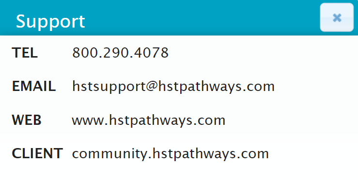 Help is always available for you. Tap the Help icon in the toolbar to open the help menu. From the help menu, users can access the HST Pathways support contact information and the help files.