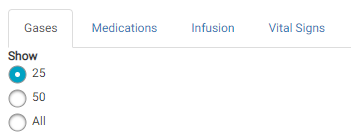 - If there are more than 25 entries in the Gases or Vitals Signs Grid Views, radio buttons will appear in those grid views. These buttons allow the user to select how many entries are displayed. The radio button will default to 25, which shows the 25 most recent entries. To view up to 50 entries, select the 50 radio button. To view all entries, select the All radio button. The radio buttons in the tabs are independent.
