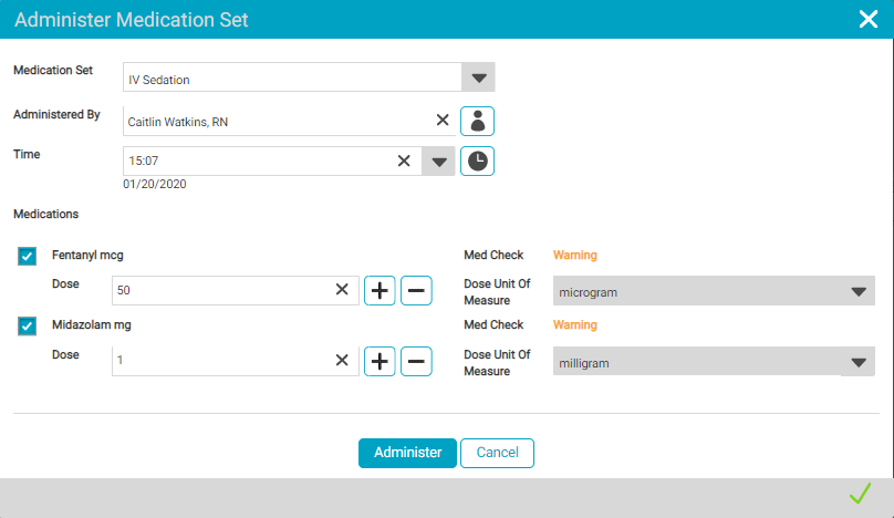 - The Administer Medication flyout will appear. If the wrong set was accidentally selected, the set may be changed by selecting a different set from the Medication Set drop-down.