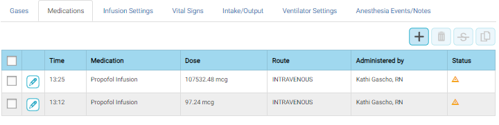 - The Grid View has different tabs for: Gases, Medications, Infusion Settings, Vital Signs, Intake/Output, Ventilator Settings, and Anesthesia Events/Notes.