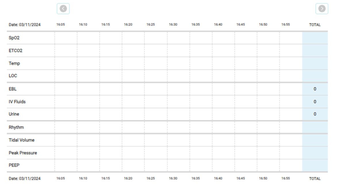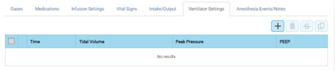 The ventilator settings Tidal Volume, Peek Pressure, and PEEP are now included in the table and in the Ventilator Settings grid view. They can be documented from and will display in both locations.