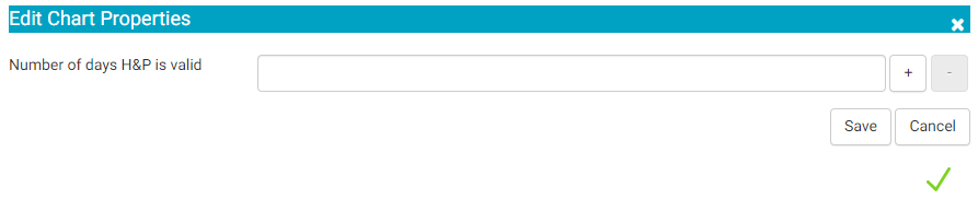 The "Number of days H&P is valid:" setting determines how many days from the date performed a scanned History and Physician is valid. (Only valid H&P documents can be used in the History and Physical Attestation BLOC.) The default value is 30 days. The value can be changed to any value from 1 to 365, but this must be edited in the Add/Update Chart Template page.