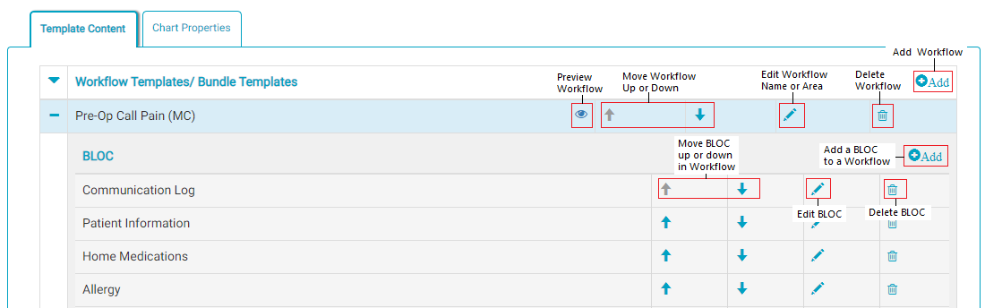 - Use the buttons detailed in the image above to add or remove workflows and BLOCs, rearrange workflows and BLOCs, or edit workflows and BLOCs names.