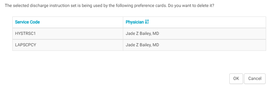 - A flyout will open prompting the user to confirm the deletion. If the Discharge Instruction Set is attached to a preference card, the flyout will list the Cards that contain the Set.