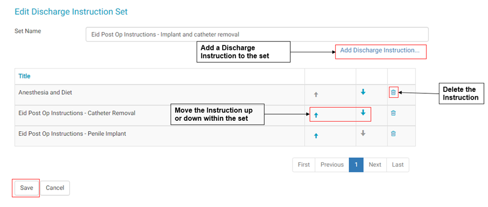 - Individual Discharge Instructions can be added, removed, or rearranged using the same techniques as when a Set is created. Note - the Set Name cannot be changed.