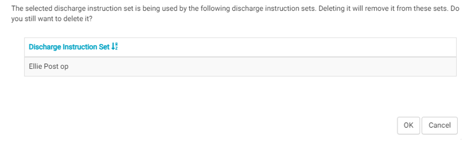 • A flyout will open prompting the user to confirm the deletion. If the Discharge Instruction is used in a Discharge Instruction Set, the flyout will list the sets that contain the Instruction.