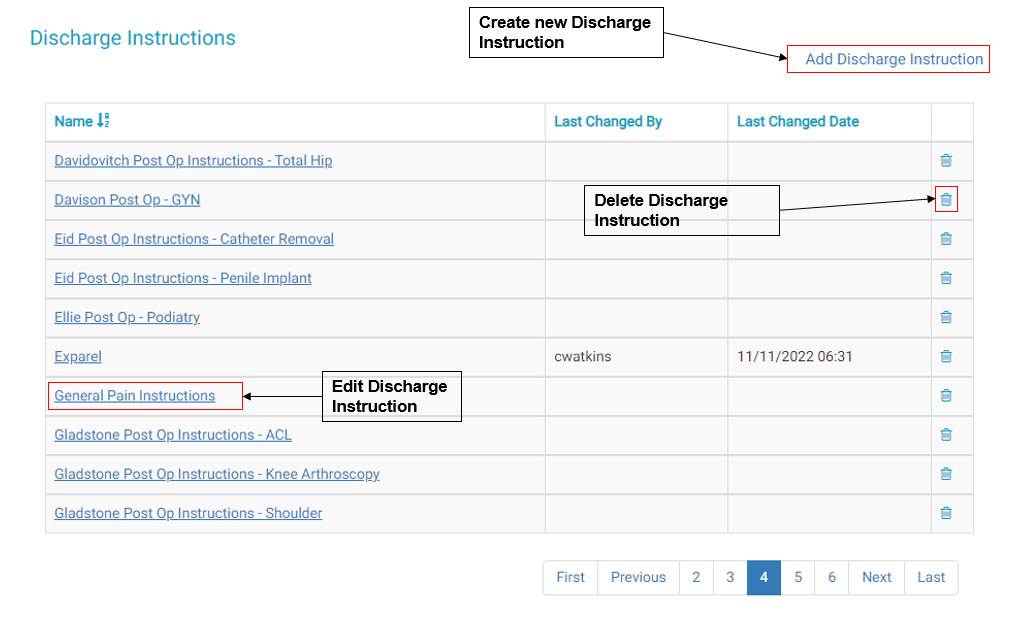 • Tap the trashcan icon to the right of the Discharge Instruction Name to delete it.