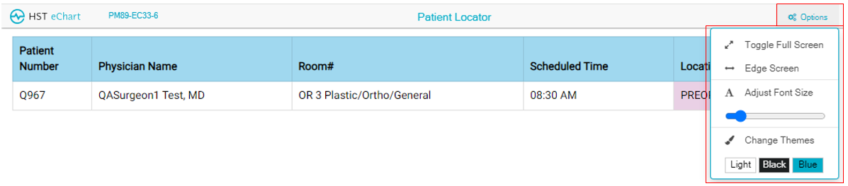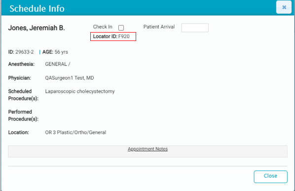 The Center can also elect to include the physician’s name, the scheduled procedure room, the scheduled time, and notes. Notes are updated from the Patient Locator.